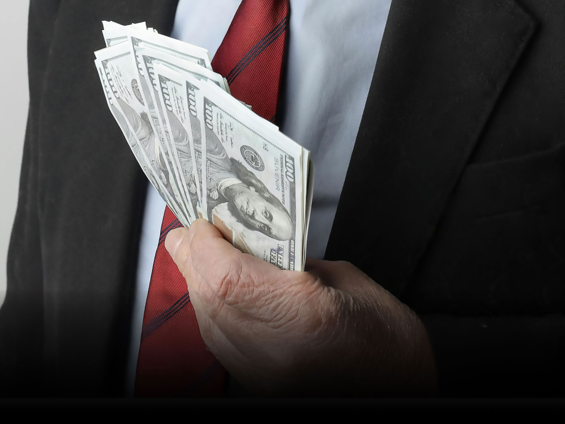 A man in a suit holds a large amount of US dollars in his hand